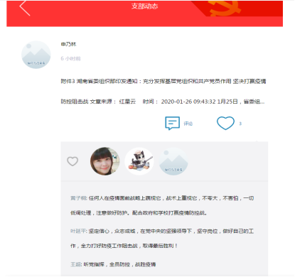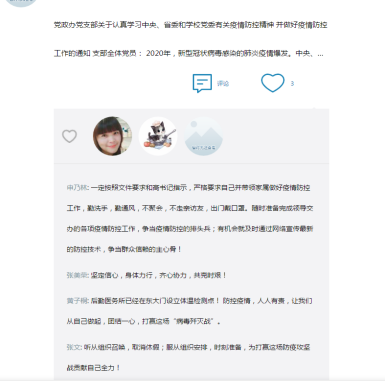 1月28日下午,学校召开了疫情防控二级单位党委书记专题会议,学校疫情防控领导组组长、校党委书记高山主持会议并作重要讲话。1月29日,机关党委根据疫情防控二级单位党委书记专题会议精神,下发通知要求各党支部组织党员认真学习,并做好疫情防控工作的周密安排。1月30日,党政办党支部根据学校党委和机关党委的要求,结合实际情况,起草了《党政办党支部关于认真学习中央、省委和学校党委有关疫情防控精神并做好疫情防控工作的通知》,通过红星云网上支部的支部动态栏目发布。通知发布后,广大党员认真学习,纷纷在平台留言评论,谈心得,说打算,表决心,取得了良好的学习效果。