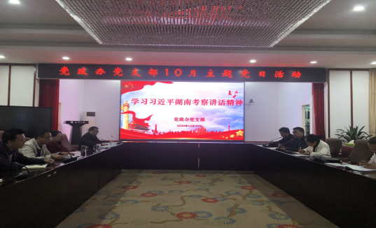 10月30日下午,党政办党支部在党政办视频会议室开展10月份主题党日活动,深入学习贯彻习近平总书记在湖南考察时的讲话精神。活动由党支部书记谢四平主持,支部全体党员参加,长沙基地的支部成员在线全程参会。