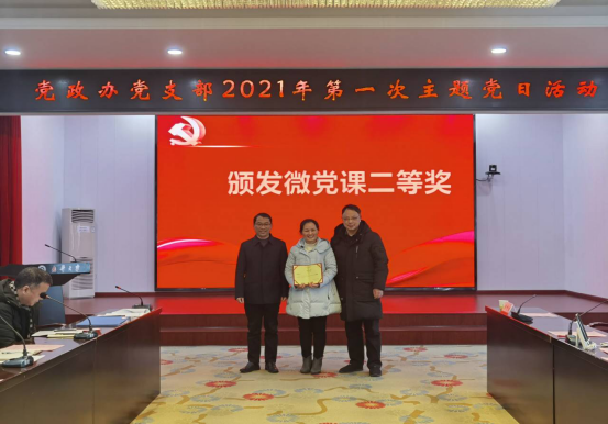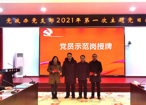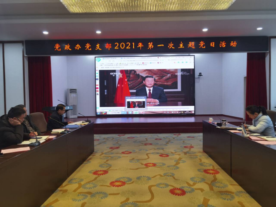 1月14日上午,党政办党支部结合现场颁发获奖党员荣誉证明、第八次教职工理论学习、党支部民主生活会和组织生活会会前意见征求、以及年度考核评优等2020年末各项工作,在视频会议室开展了形式多样、内容丰富且高质、高效的2021年第一次主题党日活动。活动由支部书记谢四平主持,机关党委书记彭仲生同志莅临指导,党政办全体党员与会。