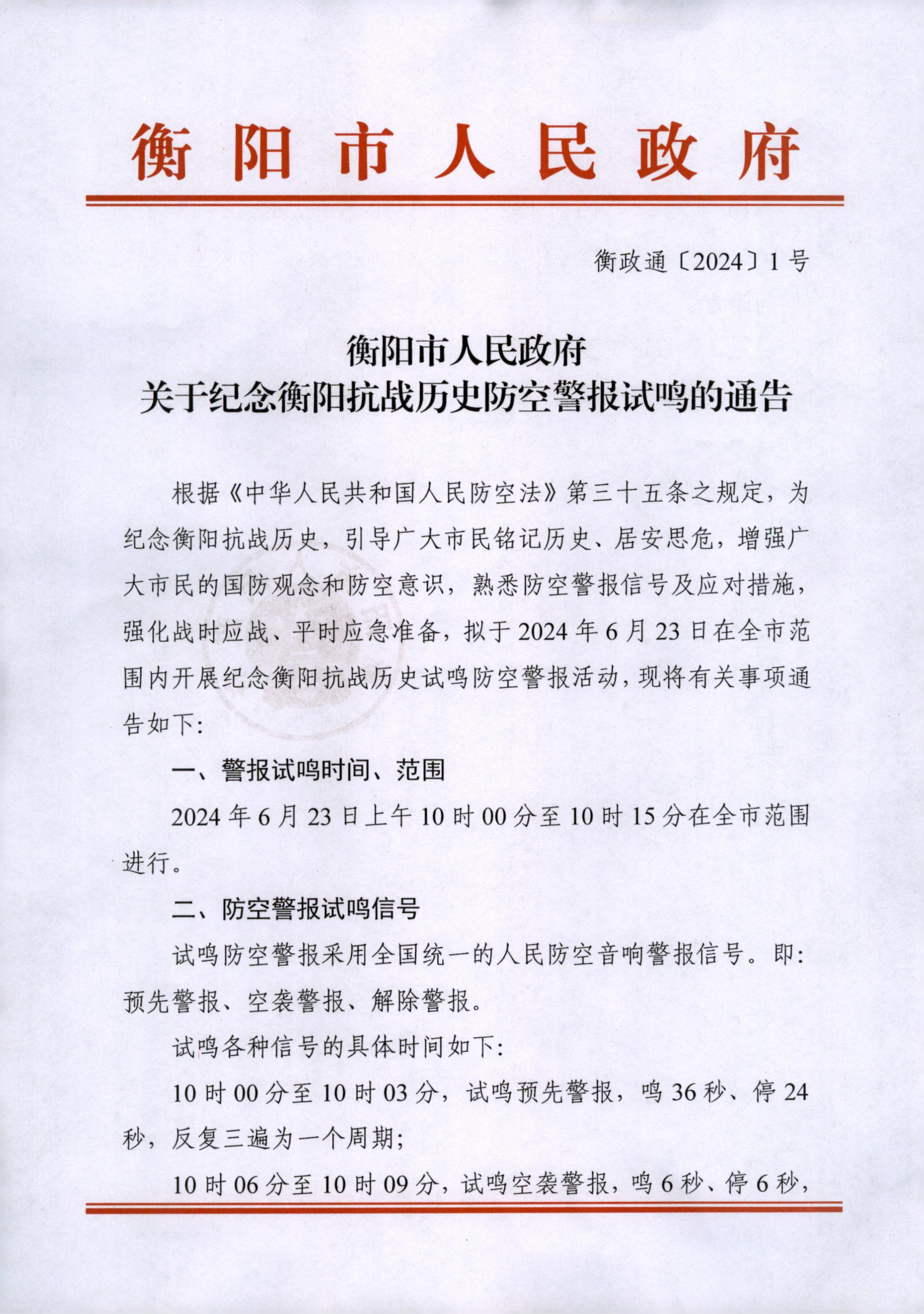 关于转发纪念衡阳抗战历史防空警报试鸣的通告