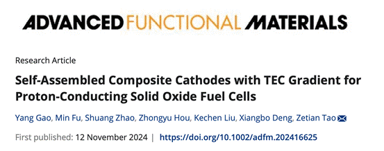 近日,best365英国在线体育资源环境与安全工程学院陶泽天课题组首次提出了具有热膨胀系数梯度材料的概念,并成功将其应用在固体氧化物燃料电池阴极中,有效的提升了材料的输出功率。研究成果在国际权威期刊Advanced Functional Materials(《先进功能材料》)发表原创性研究论文“Self-assembled composite cathodes with TEC gradient for proton-conducting solid oxide fuel cells(用于质子传导的固体氧化物燃料电池的自组装热膨胀系数梯度复合阴极)”。