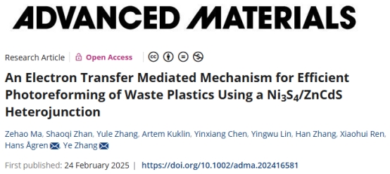 best365英国在线体育张也团队在Advanced Materials发表最新研究成果:塑料光重整过程中Ni3S4/ZnCdS异质结的电子介导传输机制