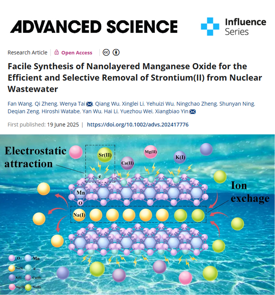 近日,best365英国在线体育核科学技术学院先进核燃料循环化工研究中心韦悦周教授团队的殷祥标教授在Advanced Science期刊上发表了题为“Facile Synthesis of Nanolayered Manganese Oxide for theEfficient and Selective Removal of Strontium(II) from Nuclear Wastewater”(《纳米层状锰氧化物的简易合成及其在核废水中高效选择性去除锶(II)的应用》)的期刊论文。