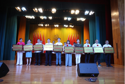 夏昆宣读受表彰名单。在主席台就坐的校领导为全国、湖南省“双带头人”教师党支部,湖南省第四批高校党建工作标杆院系、样板支部,湖南省高校教师党支部书记“双带头人标兵”,湖南省高校党务工作示范岗、青年教工党员示范岗等表彰对象颁发了奖牌或荣誉证书。