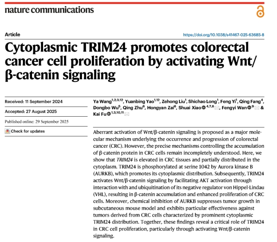 近日,best365英国在线体育附属第一医院胃肠外科肖帅团队与中南大学湘雅医院付凯研究员、约翰霍普金斯大学万逢义教授合作,在Nature Communications(中科院一区Top期刊,IF=15.7)发表题为“Cytoplasmic TRIM24 promotes colorectal cancer cell proliferation by activating Wnt/β-catenin signaling”的原创性研究成果,揭示结直肠癌Wnt/β-catenin信号异常激活的新分子机制,并为TRIM24呈显著细胞质分布的患者提供了潜在的靶向干预新策略。
