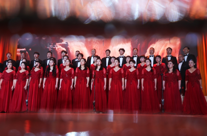 第三篇章“碧血·烽火忆” 将观众的思绪带回到救亡图存的烽火岁月。男声独唱《赤伶》创新融合传统戏腔与现代音乐,唱出了深沉的家国情怀与风骨;《大刀进行曲》《团结就是力量》等抗战歌曲联唱以排山倒海之势,再现了中华儿女不屈不挠的钢铁意志;女声合唱《南泥湾》以悠扬而坚定的歌声,颂扬了自力更生、艰苦奋斗的宝贵精神;混声合唱《怒吼吧!黄河》则以磅礴的气势与情感张力,将本篇章推向高潮,展现了黄河咆哮、民族觉醒的壮烈画卷。第四篇章“蔚蓝·新征程” 聚焦新时代的壮阔征程,《灯火里的中国》《功勋》等歌曲,唱响了对伟大祖国和时代楷模的深情礼赞。
